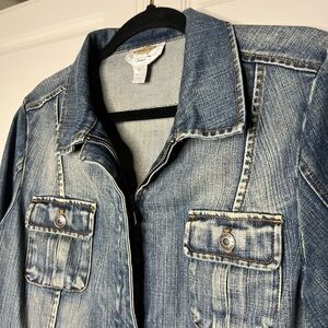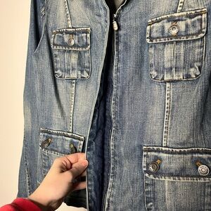 Classic denim jacket made of cotton spandex blend. Vintage from early 2000s. Classic style with large safari pockets on the front and full covered zipper. Collared. Size 10.