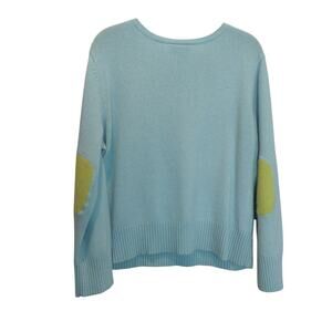 Vintage Talbots sky blue sweater with green elbow patches. V neckline. Soft and thick. Merino wool, angora rabbit hair, cashmere blend.