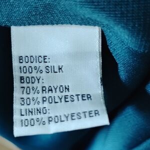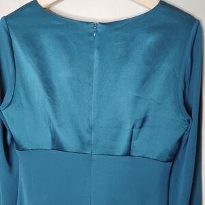 Elegant vintage Talbots midi in a rich teal. The bodice is 100% silk satin with a sculpted bow-bust/V-neck, flowing into a soft rayon skirt (fully lined) with a flattering A-line/column drape. Long sleeves, hidden back zip. Perfect for holiday parties, winter weddings, theater nights, or cocktail events.