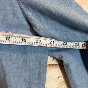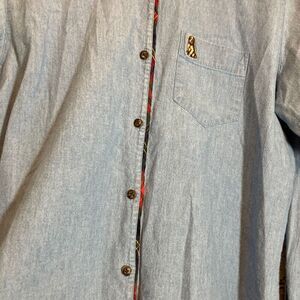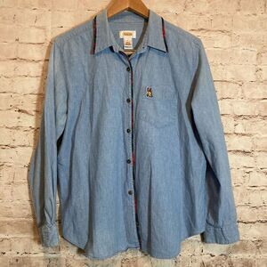 Vintage Talbots Top Womens Large Chambray Blue Button Up Embroidered Dog Cotton