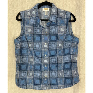 Vintage Talbots Womens Top Large Blue Country Patchwork Button Up Sleeveless