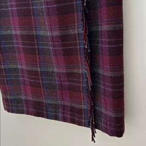 Classic vintage Talbots plaid skirt crafted from Italian wool blend fabric. Features a wrap design with button closure and fringe trim accent. Rich plum, burgundy, and blue plaid tones — perfect for fall/winter or a timeless academia-inspired wardrobe.