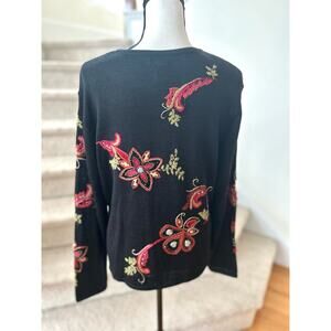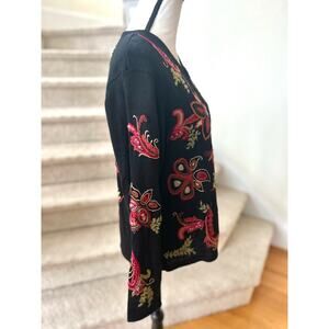 Excellent condition. Black base, pink and sage green paisley floral embroidery through out. Front zipper. Long sleeves, scoop neck.