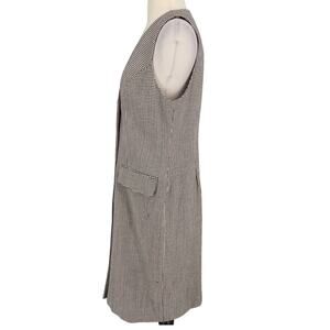 I am obsessed with this dress! A sleeveless wool blend midi dress with a white/black/maroon houndstooth pattern and double breasted black button front. Features darting and two front flap pockets. Fully lined. Looks so cute solo or layered with long sleeves and riding boots!