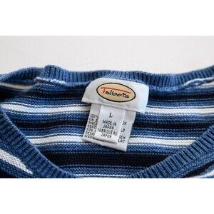 The Vintage Talbots blue striped cotton short sleeve sweater is a stylish and comfortable pullover for women. Made of breathable cotton knit, this sweater features a classic round neck and long sleeves, making it perfect for casual occasions. The size L and blue color add a touch of classic style to any outfit, while the Talbots brand ensures quality and durability. Perfect for layering or wearing on its own, this sweater is a versatile addition to any wardrobe.