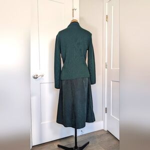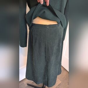 Vintage Talbot's merino wool and faux suede matching two-piece set in a deep forest green. Includes matching sweater jacket and skirt. Skirt looks almost black in some photos, but it is very much a dark, rich, forest green.