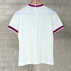Stylish Talbott Travler blouse with red and blue collar on neckline and sleeves. 100% Dacron Polyester material. Shirt is cream colored and would require a camisole be worn underneath. In great condition, stored in a pet/smoke free home.