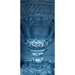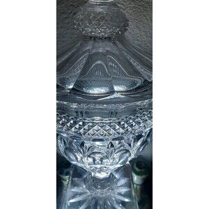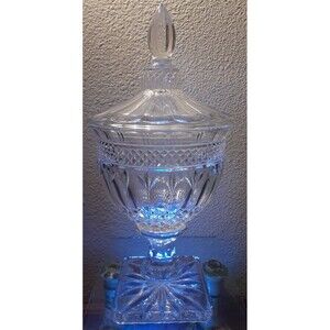 This 15" tall lidded bonbon candy dish is made with lead crystal. I paired it with a cordless string of citrine-colored twinkle lights (battery powered & remote controlled) to showcase the clarity and brilliance of the crystal and to create a warm mood in the room. The pictures provided also show it on a lighted platform with blue LEDs below, and without additional lighting in a room that is lit with CF bulbs.