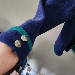Gold buttons, navy blue knit with teal green contrast.