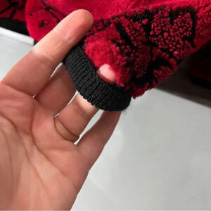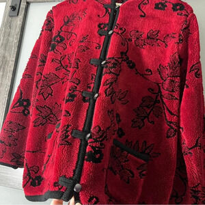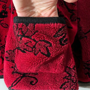This gorgeous deep red vintage jacket from Tally-Ho features an overall beautiful black floral and leaves design, it is collarless and kimono style with buttons down the center and black lining throughout. Made from a poly/acrylic blend it feels very fluffy and soft. Two small front pockets. Item is preowned and has a small hole in the lining - see pics. If you are able to sew you could easily repair this. It is a women's size small.