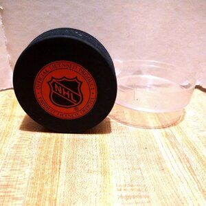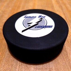 Blue and white Tampa Bay Lightning logo on one side, redddish orange NHL logo on other side. Rim of hockey puck says "Made in Czechoslovakia Official" (too dark to photograph). This collectible National Hockey League puck comes in a clear plastic case. Case has some scratches, puck itself is in excellent vintage condition. Nice memorabilia gift for a Tampa Bay Lightning sports fan! See images for dimensions.