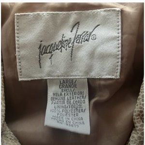 90s beige Genuine Leather Jacket, Size Large, see photos for measurements. Python, snakeskin textured leather. Jacqueline Ferrar Brand. Some wear, small spots shown in last 2 photos. Full zip, pockets. Beige Nude Monochromatic Neutral