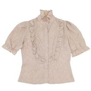 Vintage tan leafy bib ruffle blouse in size small. Tan fabric with shiny embossed leaves. Stand collar with ruffles and button-down closure. Ruffle bib detail on the front. Half puff sleeves with elastic ruffle cuffs. Wear this blouse under a dress or with a plaid mini skirt.