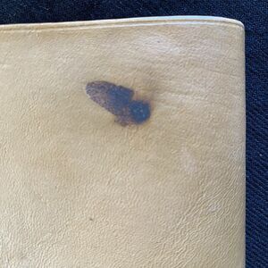 Please check all photos and measurements carefully for best description and let me know if you have any questions. Wallet is New but does have some discoloration due to age and a burn mark on back as seen in photos.