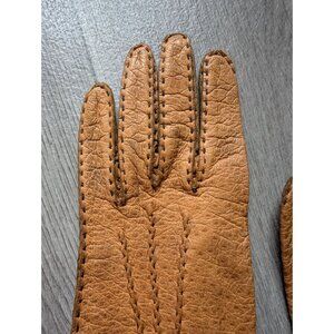 Classic tan leather gloves with detailed stitching provide a timeless and functional accessory for cooler seasons. Comfortable and durable for daily wear.