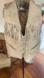 Stylish tan suede vest with fringe details. Features button closure and pockets. The tag says leather but it looks more like suede. There are some black scuff marks as shown in the photos. This vest is from the late 80's and I wore it maybe twice.