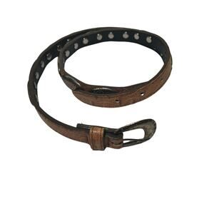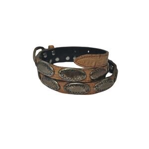 Vintage Tan Western Skinny Concho Belt Silver Tone Rounded Etched Buckle Size L
