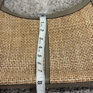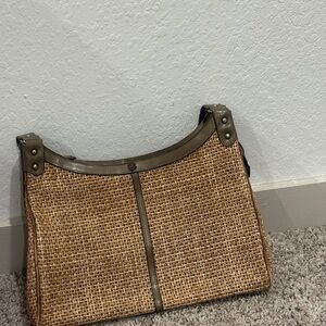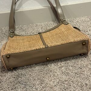 This elegant shoulder bag features a woven texture in a natural tan color, complemented by rich brown leather trim. Its classic hobo shape and curved top edge make it a versatile accessory for any occasion. The textural contrast adds a touch of sophistication to its casual design. It is in good condition it has some stains on the inside but overall in very good condition.