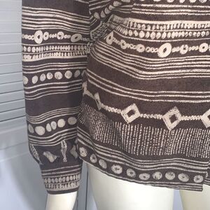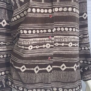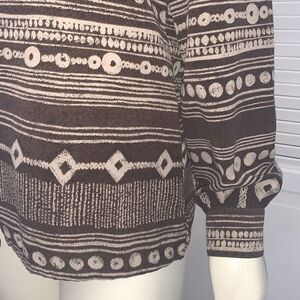 Soft button down collared Aztec print brown beige women’s long sleeve top. Pleated adjustable button cuff sleeves. Deep dark red buttons. Excellent vintage condition. Women’s size 10 medium.