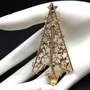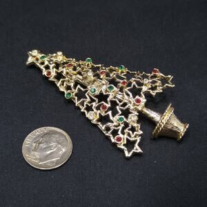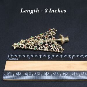 Known as a “book piece,” this exact brooch is pictured on page 73 of Christmas Jewelry by Mary Morrison, where it is described as a slender, open triangle of stars with scattered rhinestones. At a striking 3 inches tall, it makes a bold holiday statement.