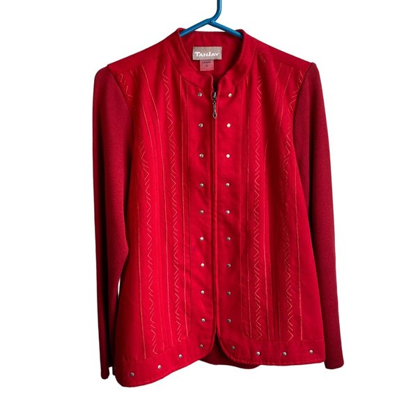 This Vintage Tanjay women's jacket, in size medium, is a stunning blend of faux suede and knit fabric. It comes in a rich red hue, adorned with studs, and features a zip-up design for a trendy and chic look.