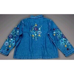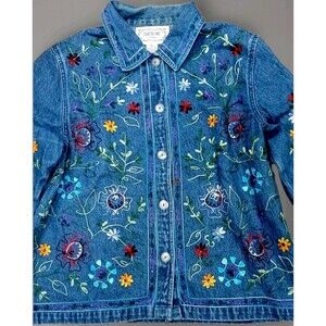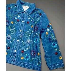 Gorgeous Vintage Tantrums Petite Large embroidered denim jacket fully floral stitched front and back with bright cottagecore / boho / artsy Y2K vibes.