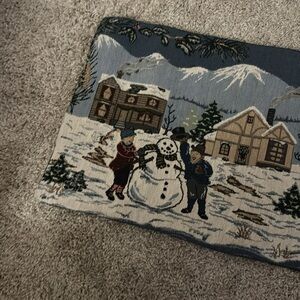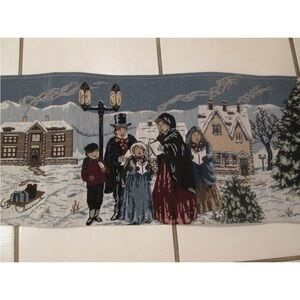 This is a Christmas Village Carolers Tapestry Table Runner.