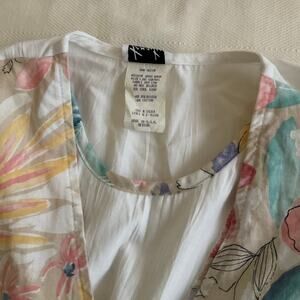 Fun watercolor floral design on this top. Tie back waist, shoulder pads and front buttons. Can only be worn buttoned up as it is a faux vest shirt top with the white front undershirt being a bib, not a full shirt.