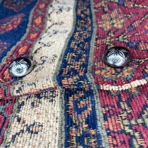 Make a bold statement with this rare and richly patterned jacket from Every Stitch Counts (Fort Worth, TX). This vintage gem features a woven tapestry-style fabric in earthy jewel tones of burgundy, navy, and cream — giving total western-boho-grandma-core energy in the best way.