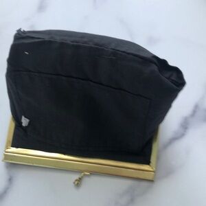 Item is in good used vintage condition: outside fabric and inside lining are clean. Small marks on the top and back of the gold metal exterior near the clasp, see photos.