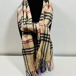 Vintage Tartan Plaid Fringe Scarf Womens Soft Cashmere 12x54 Tan Red Black