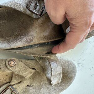 Lightly used taupe Birkenstock Boston Clogs size 38 from circa 2000. These are in amazing shape with the only signs of age/wear being some spots that could be glued, but will probably be just fine if you leave them as they are. Photos show wear (and lack thereof). They're not smelly or anything!