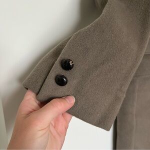 Vintage wool double-breasted taupe coat from Egon von Furstenberg. 100% pure wool. Size 42R. Measures to be 24” from pit to pit and 42” long from shoulder to hem with an 18” slit in the back. Just missing one non-functional button on the left sleeve cuff. Excellent pre-owned condition