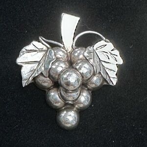 Beautiful vintage sterling silver pendant handcrafted in Taxco, Mexico. Features a three-dimensional grape cluster with intricate leaf details and a wide bail to fit various chains. Stamped “925,” “Mexico,” and hallmarked in a triangular formation, indicating origin and authenticity. This classic artisan piece is a wonderful example of mid-century Mexican silversmithing.