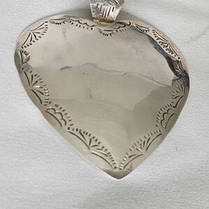 A substantial and striking vintage sterling silver heart pendant, hand-crafted in Taxco, Mexico. This statement piece features traditional Southwestern-style stamped detailing along the border and bail.