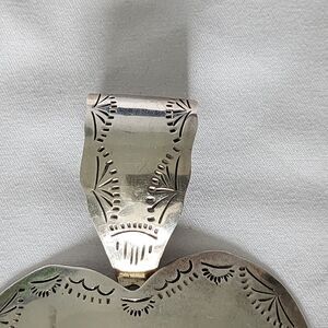 Vintage pre-owned condition. The piece shows surface scratches consistent with age and normal wear. It has a nice natural patina (tarnish) in the crevices of the stamped design which highlights the pattern. It can be polished to a high shine if the buyer prefers.
