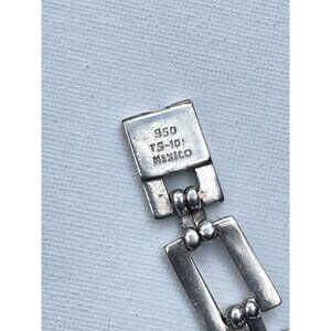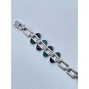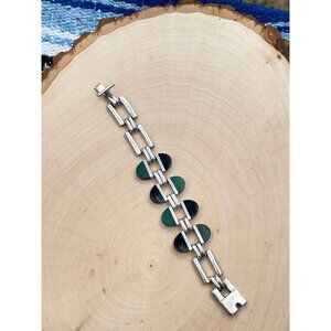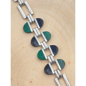 This sterling silver bracelet boasts a refined and elegant design, highlighted by exquisite malachite and onyx gems. With a length of 7 inches and a weight of 57 grams, this vintage piece, dating back to the 1980s is sure to add some everyday style. Made in Taxco, Mexico