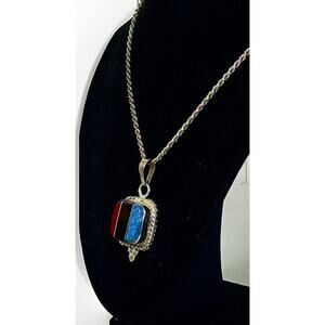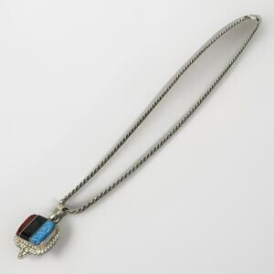 Vintage Taxco Sterling Silver Inlay Pendant Necklace – Coral Onyx Turquoise- 27”