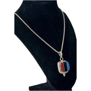 Vintage Taxco Mexico sterling silver pendant necklace with red coral, black onyx, and turquoise inlay