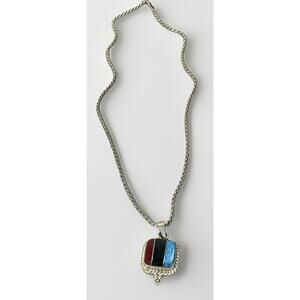 Vintage Taxco Sterling Silver Inlay Pendant Necklace – Coral Onyx Turquoise- 27” approximate length