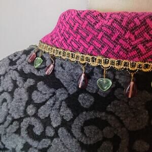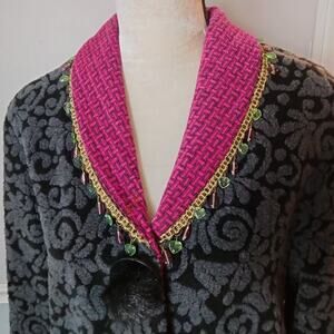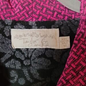 Vintage Taylor G Dallas women's black fleece jacket with pink collar. Textured paisley pattern. Unique beaded trim on the collar.