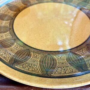 Set of two vintage Taylor Smith & Taylor “Cannes” pattern plates featuring a bold atomic onion and geometric design in rich brown over a mustard yellow background. Classic mid-century modern dinnerware with a retro vibe.