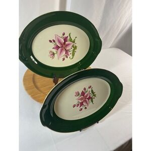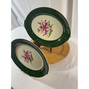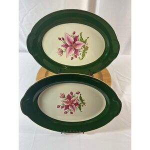 Enhance your table setting with this charming set of two vintage Taylor Smith serving platters, featuring a delightful floral lily pattern and accented with a green rim. Crafted with care and attention to detail, these platters exude timeless elegance and retro charm. Whether you're hosting a dinner party or serving up a special meal for your loved ones, these platters are perfect for showcasing your culinary creations with style. Made by Taylor Smith in the mid-century era, they are a testament to quality craftsmanship and enduring design. Don't miss the chance to add a touch of vintage flair to your dining experience with this lovely set of Taylor Smith serving platters.