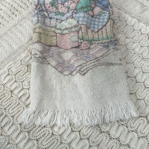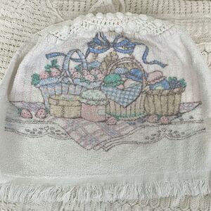 Vintage Tea Towel Crocheted Hanger Button Strawberry Basket White