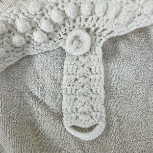 Vintage tea towel with hand-crocheted topper in white. Loops over oven handle and buttons. Great condition - no staining or holes - but patterned has lightened over time. Strawberry and jam pattern.