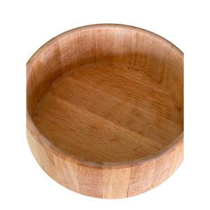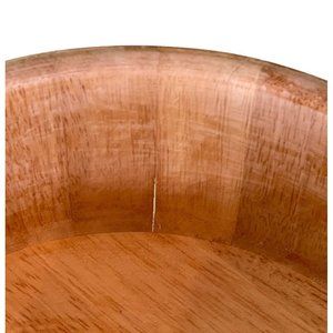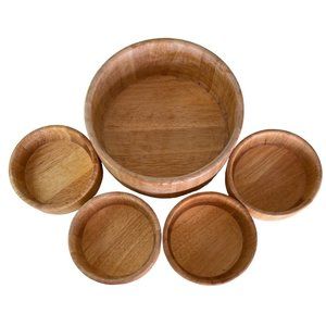 Vintage 1960's Teak wood salad serving set. One large salad bowl and 4 individual serving bowls. Made in Thailand. The large bowl measures approximately 10" across and 4" tall. The smaller bowls are approximately 6" x 2" tall. All are in nice condition but do have wear marks from use. The large salad bowl has seams where the wood pieces meet. For this reason the bowl would not be good for liquid. It will be fine for salad, chips, nuts, etc. Please zoom into my close up photos for detail.