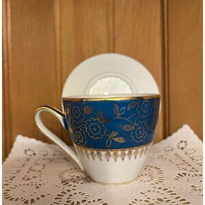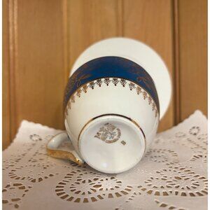 The saucer is unmarked in a simple white with a gold trimmed band and the teacup is marked MZ Czechoslovakia. The MZ marked on the bottom of the teacup stands for Moritz Zdekauer. The cup is made of a fine porcelain with a gold floral bohemian pattern on a teal blue background.