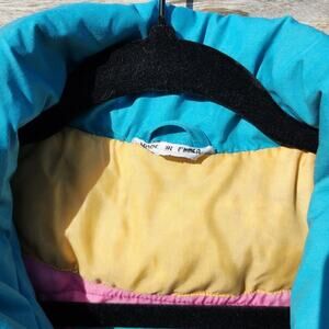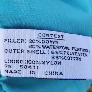 Cozy vintage teal down-filled jacket from Fleet Street’s “Down Explosion” line, featuring bright contrast lining and classic late 80s/early 90s outdoor styling. Features drawstrings, adjustable cuffs, and warm insulation (80% down / 20% waterfowl feathers). Rare brand with faded interior label—great retro ski, mountain, or cold-weather look.