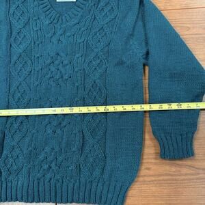 Vintage Teal Green Cable Knit V-Neck Unisex Sweater Handmade Peru Alpaca Wool OS