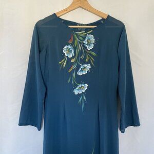 Vintage Teal Maxi Dress With Floral Hand-Painted Design & Long Sleeves high slit
